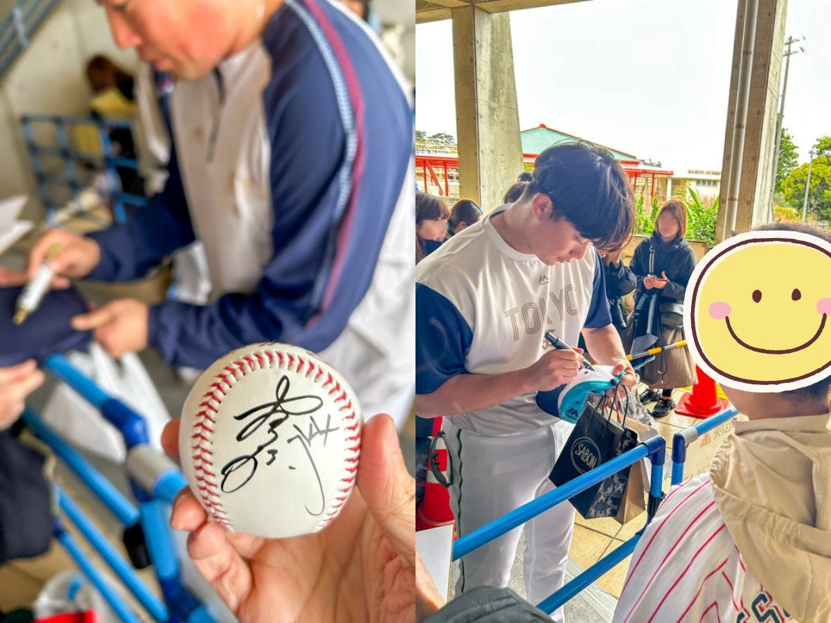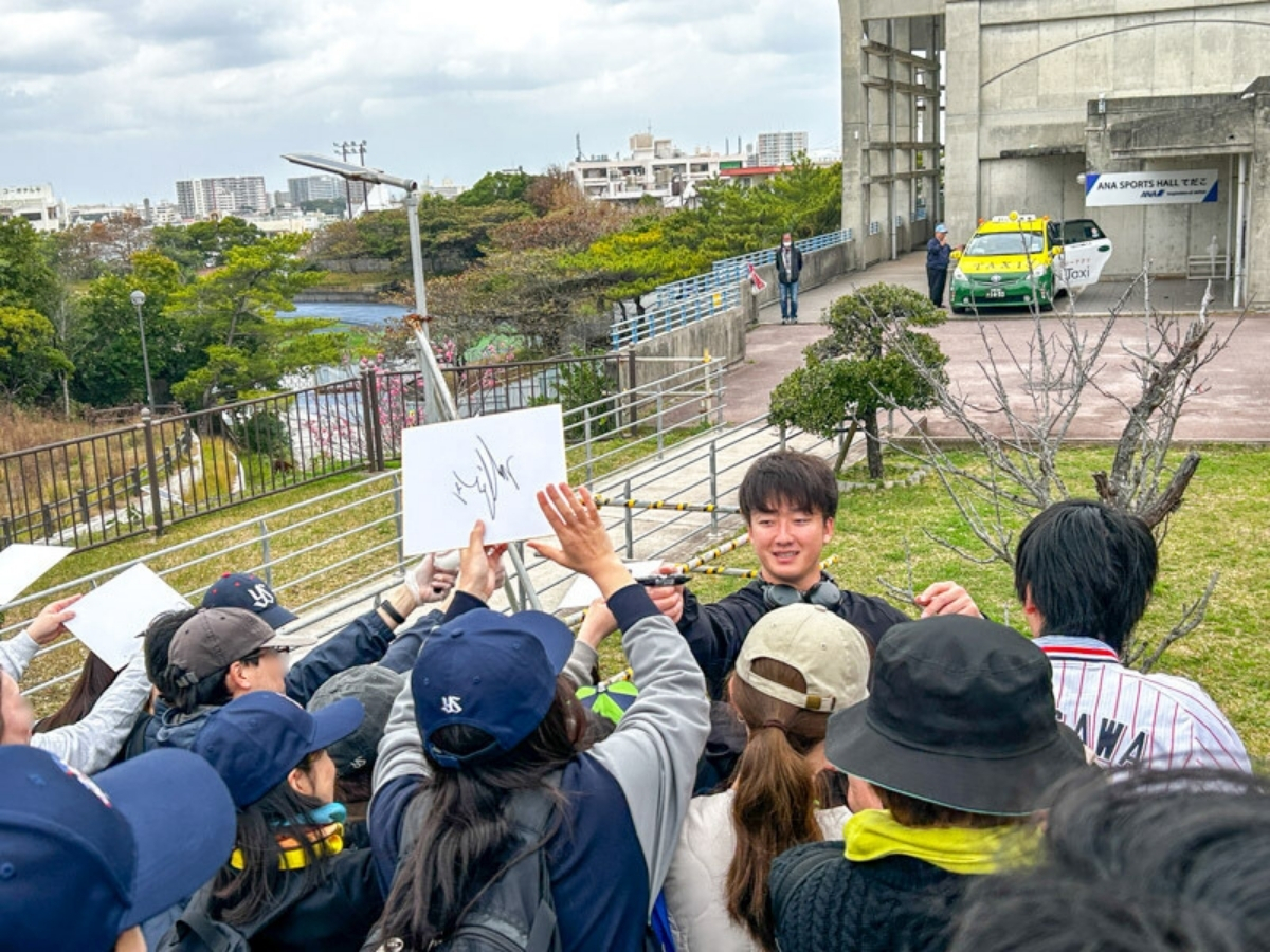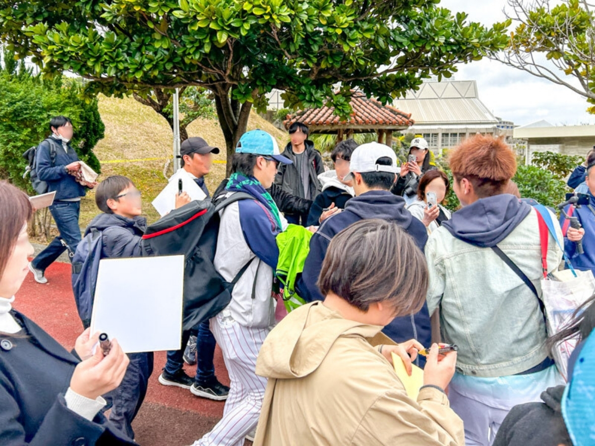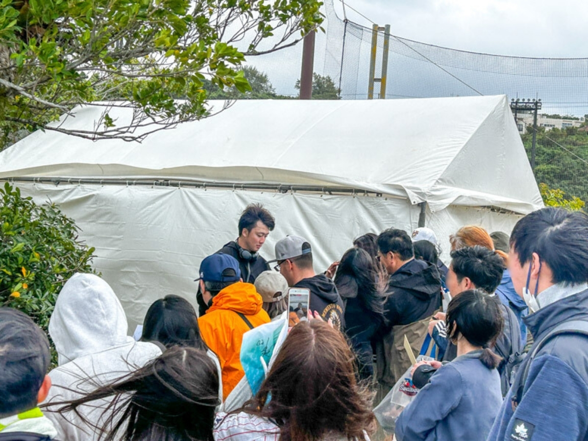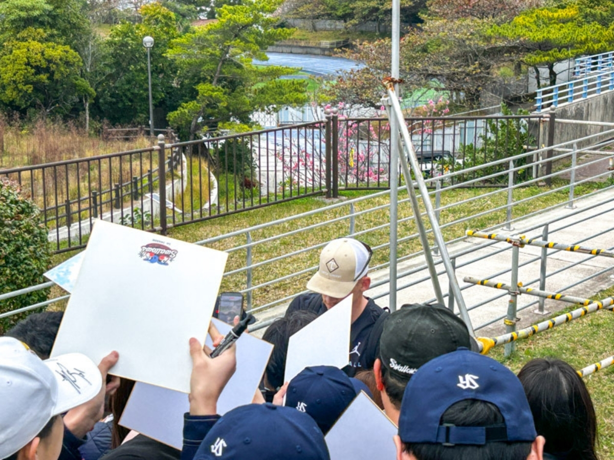 投手のサインをもらいやすい時間帯は10:45-11:15頃と12:30-13:15頃という感じでした(1日の練習表にもよるのであくまで参考目安)。なお、バッティングピッチャーをする投手は10:45-11:15頃は応じることはできず、サインに応じてくれるとすると12:30-13:15頃の時間帯という感じでした。
