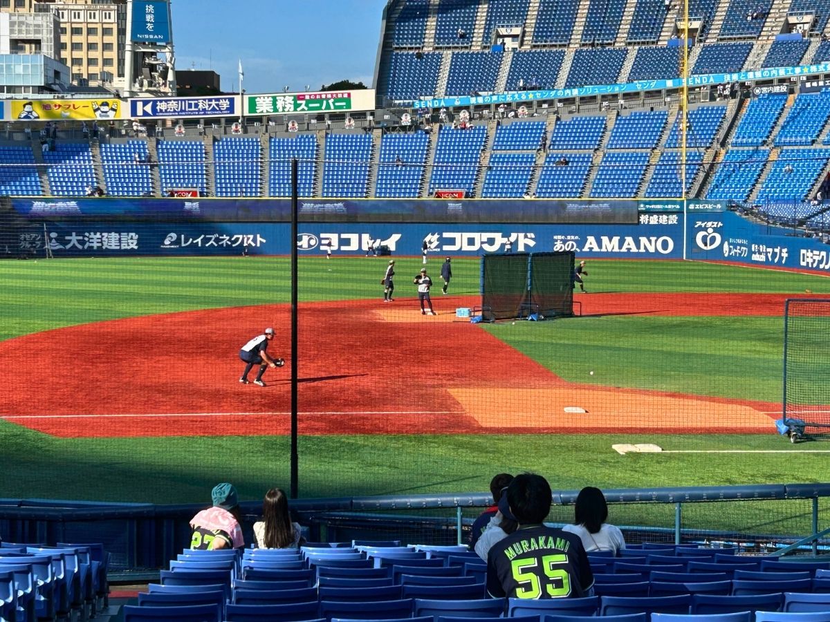 試合開始2時間前は、神宮球場だと対戦チームの練習時間ですが、横浜だとヤクルトがビジターなので練習を見ることができます!