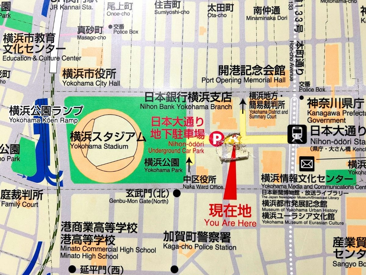 ちなみに、駐車場へは公園沿いの入口から入るのですが、車を停めた後に地上に出てくるところは、上のマップの現在地のところで、少し横浜公園から離れたところになるので、帰り戻るルートが分からなくならないよう要注意です。